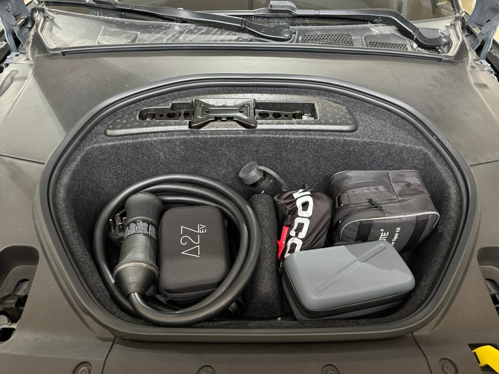 It’s important to have properly inflated tires on any car for safety, but with an EV it also helps get you your best efficiency. I keep a small, battery-powered tire inflator in the frunk. It doubles as a phone battery back, although I haven’t had to use it for that.