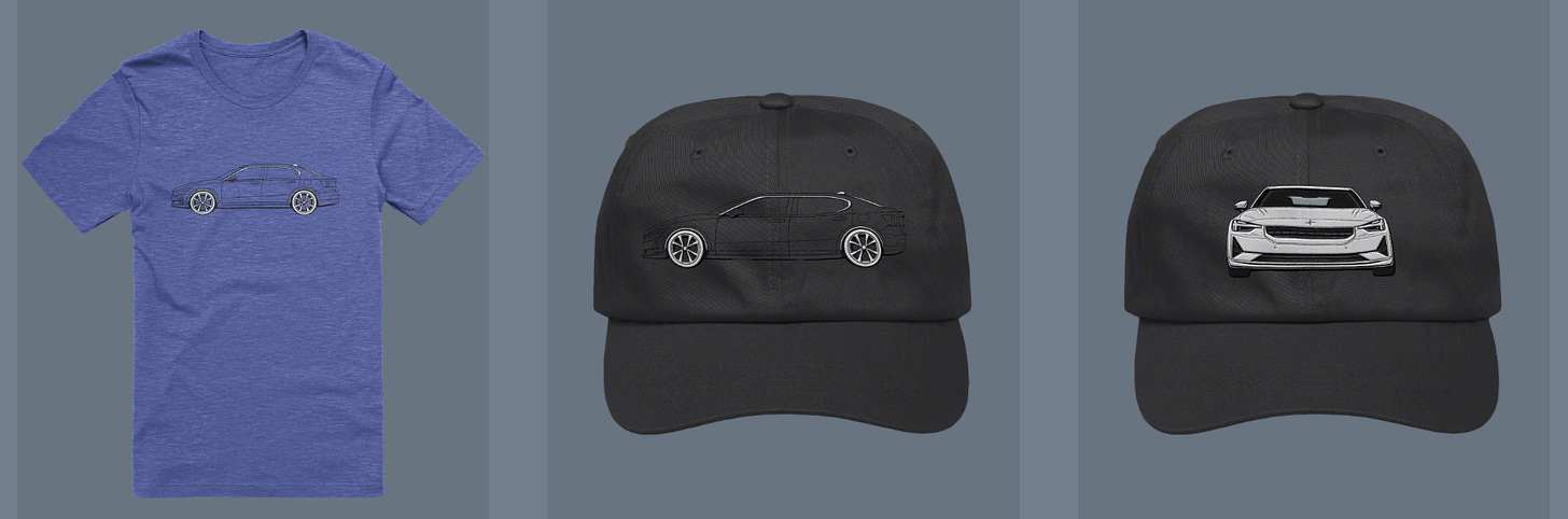 If you want to show off your Polestar 2 you might like some of the t-shirts and hats available in the Current Notes shop.