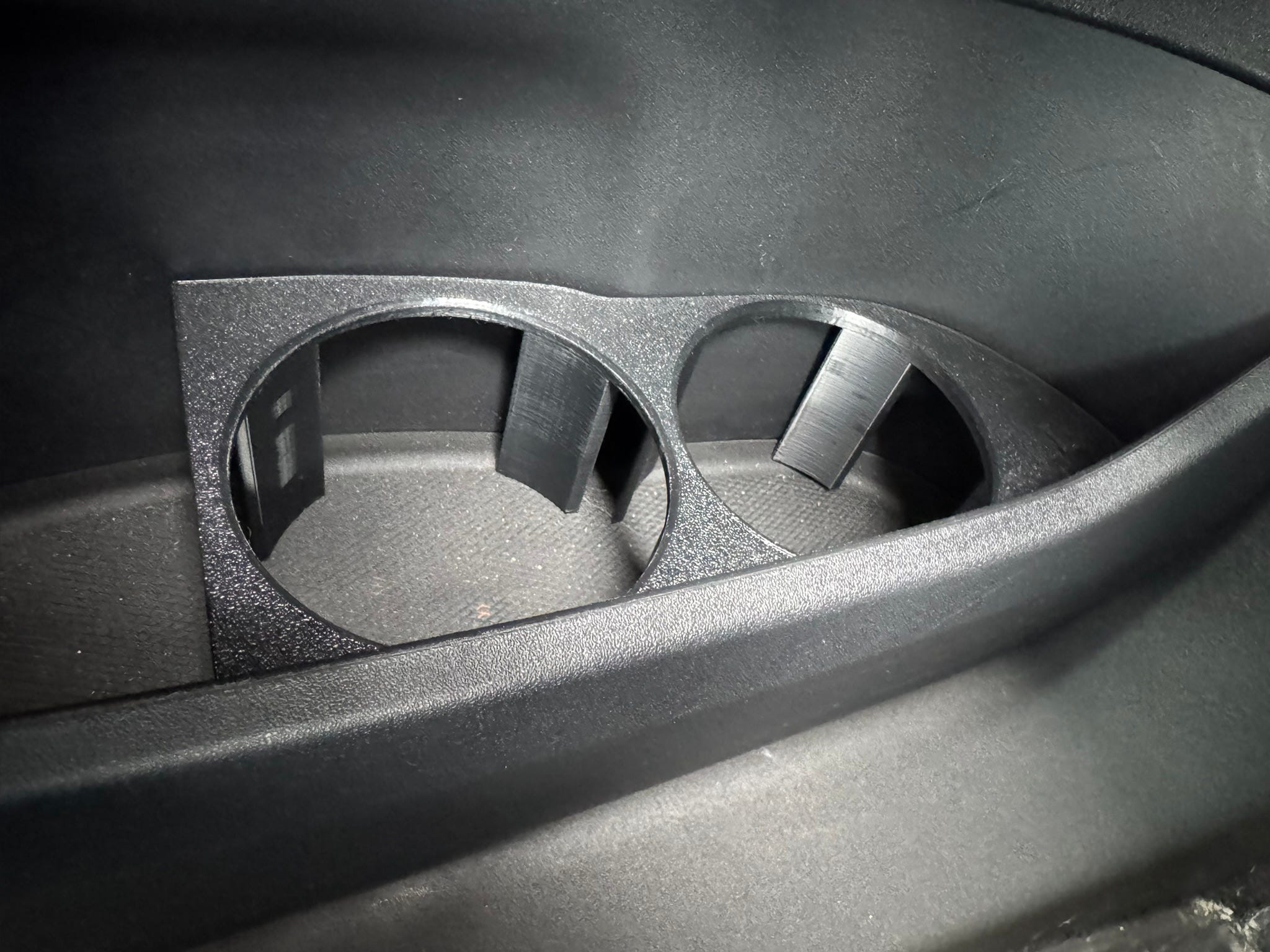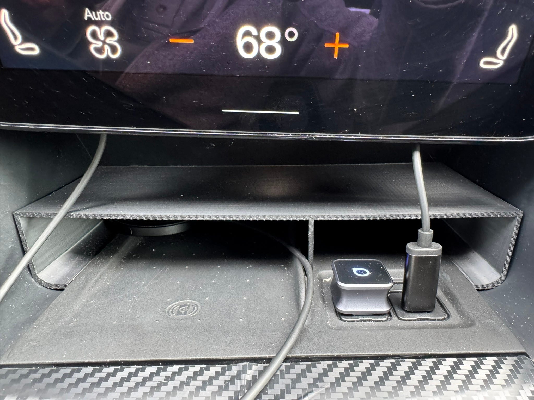 Front-seat storage is minimal. This mostly works for me as I don’t tend to keep junk in my car, but things can get tight quickly when it’s more than just me in there. I bought some 3D printed cupholders for the door pockets and a small shelf for the center console below the infotainment, which helps somewhat.