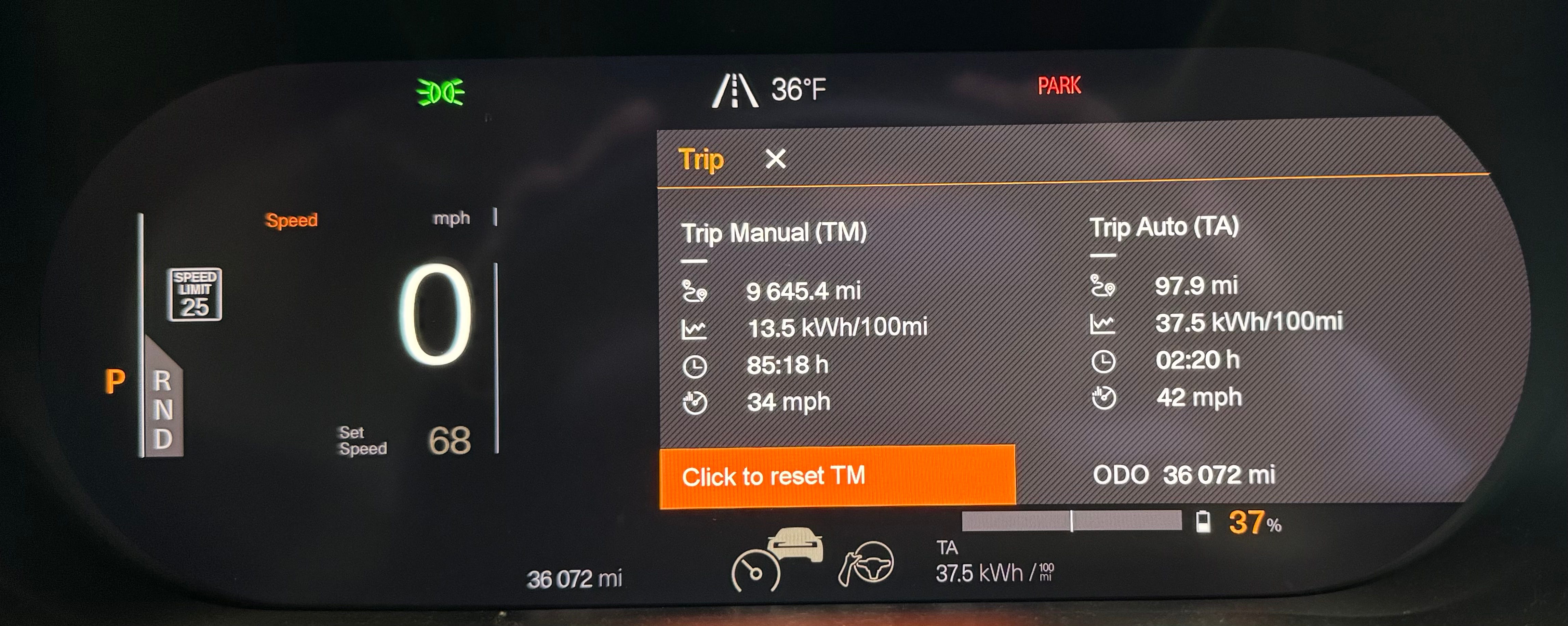 On this recent 98 mile trip, you can see I got 37.5 kWh/100mi, which is 2.67mi/kWh. The temp was on the cold side, however.