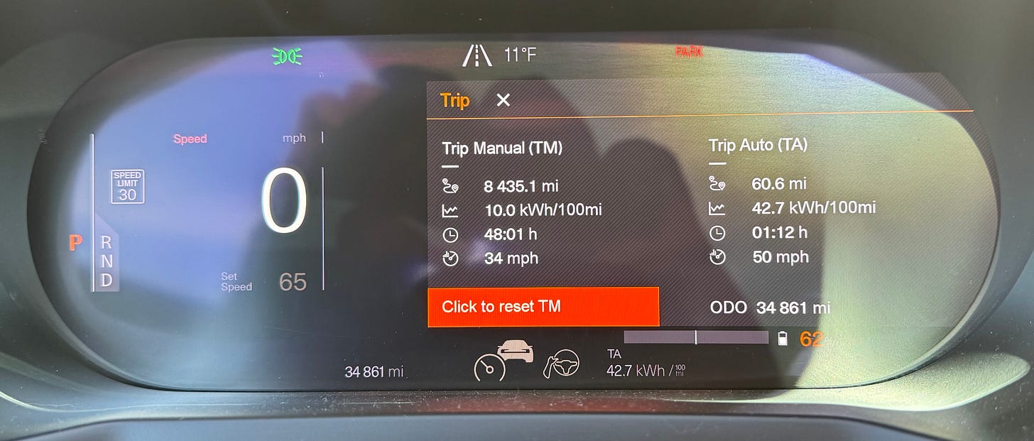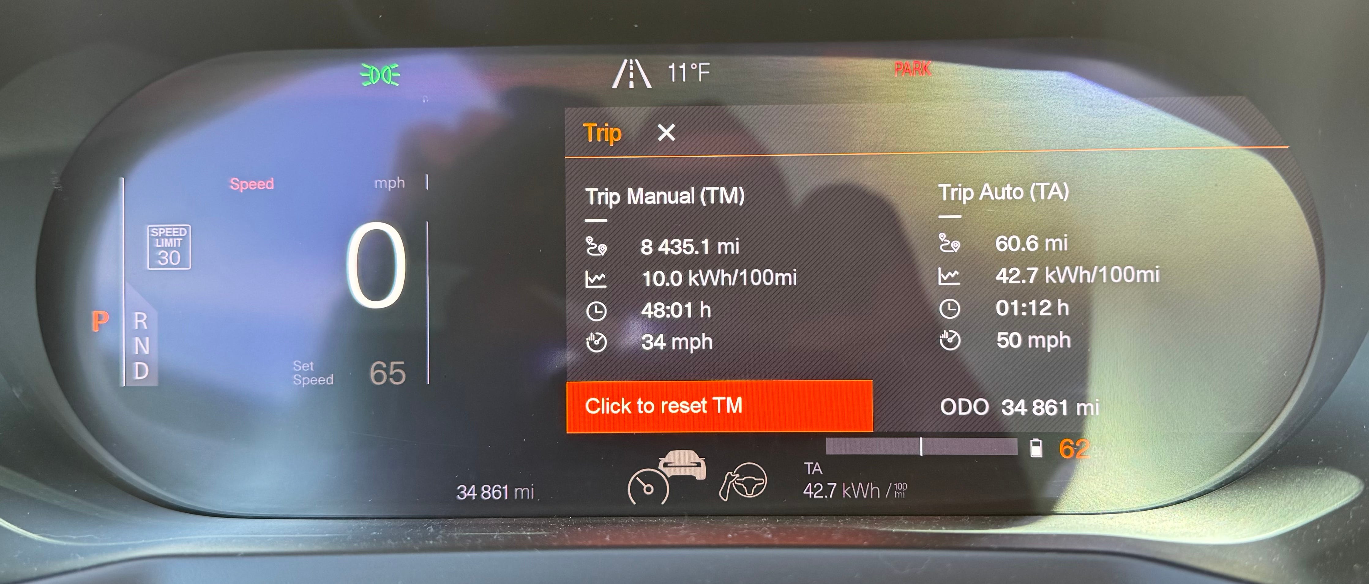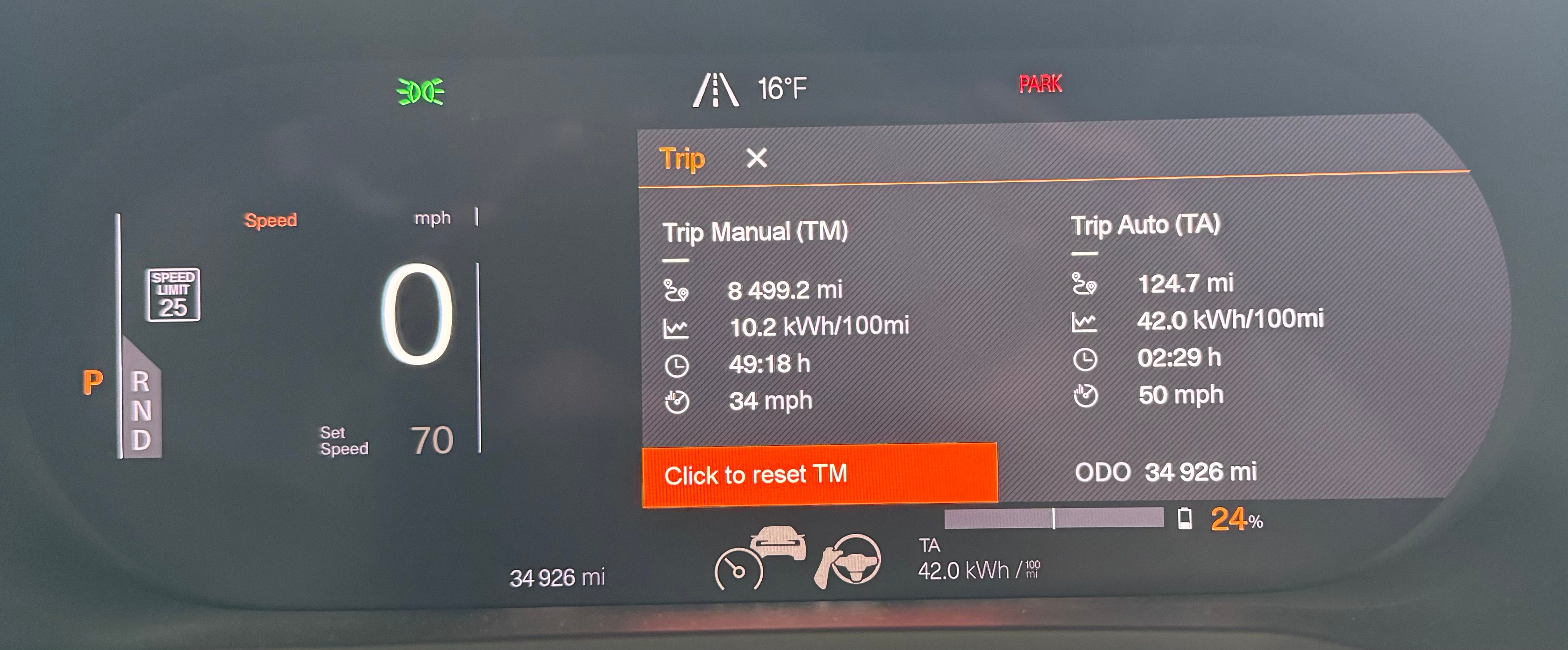 The Polestar 2 has about 75kWh usable battery, so that efficiency comes out to a maximum range of about 175 miles, not that I’d want to push things down to zero in such cold weather.